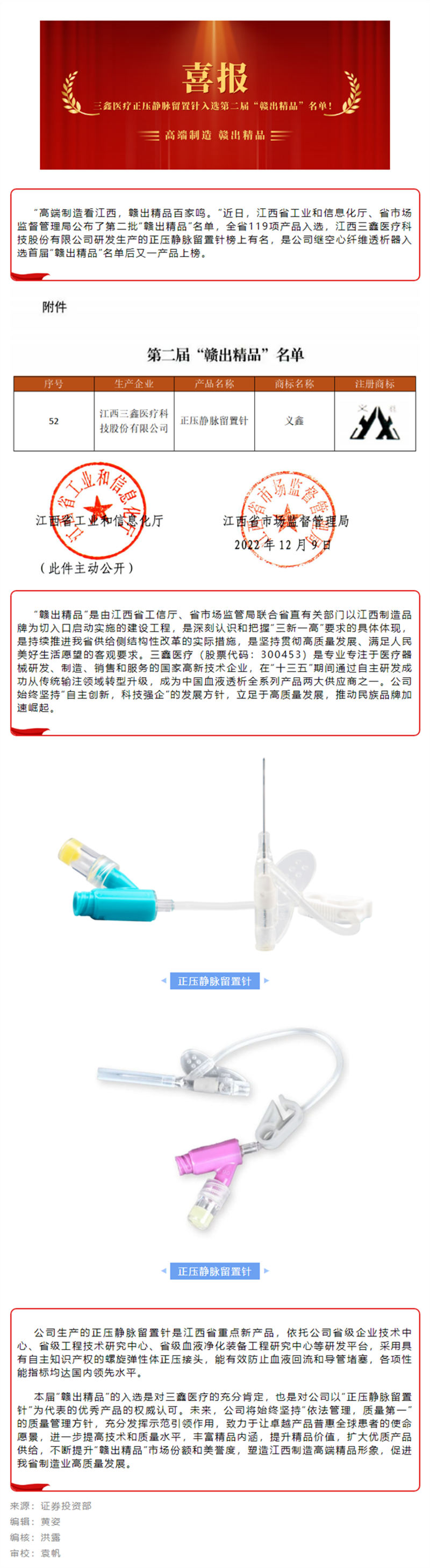 喜讯 | 6t体育医疗正压静脉留置针入选第二届“赣出精品”名单!